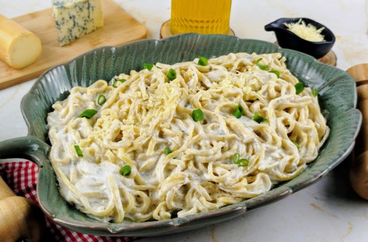 - Escorra a massa e transfira imediatamente para a panela do molho. Misture delicadamente para envolver todo o talharim no molho cremoso;